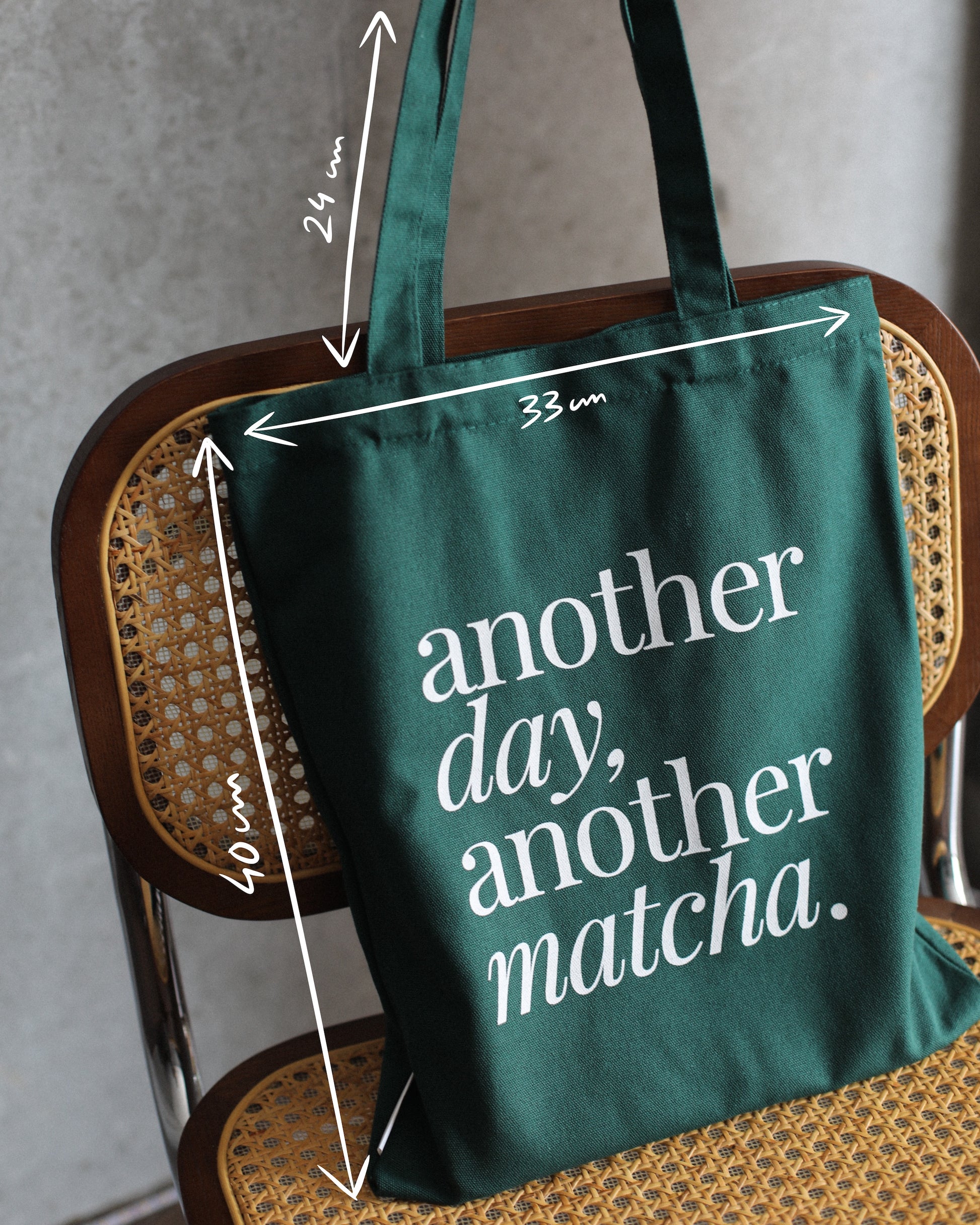 The design features the phrase "Another Day, Another Matcha" in a stylish print that reflects your passion for the little joys in life. Whether for shopping, the gym or a casual stroll, this bag combines functionality with an aesthetic touch that you will love.