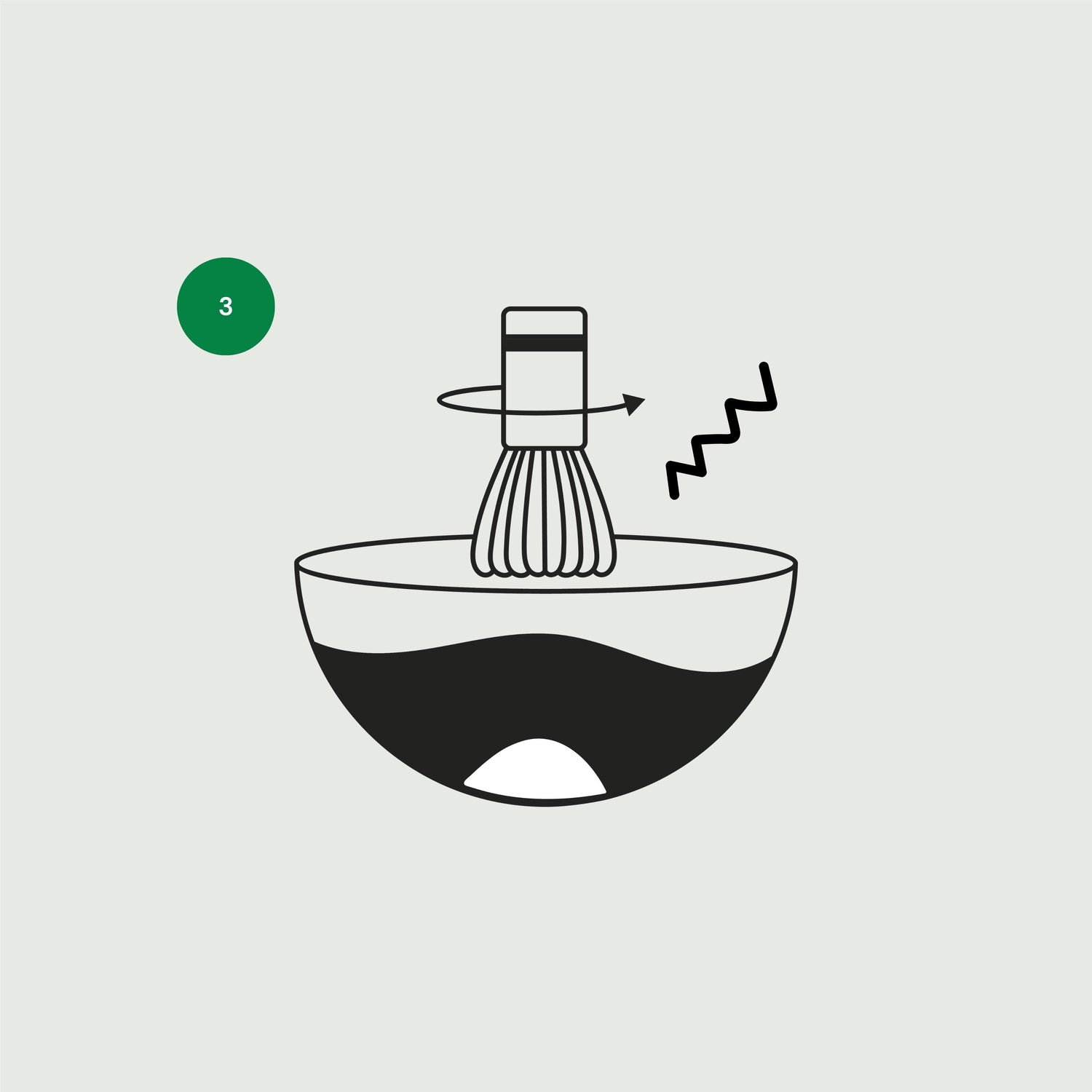 Agrega el agua caliente al bol de té y mezcla enérgicamente en forma de zigzag hasta disolver y formar una fina capa de espuma en el matcha.